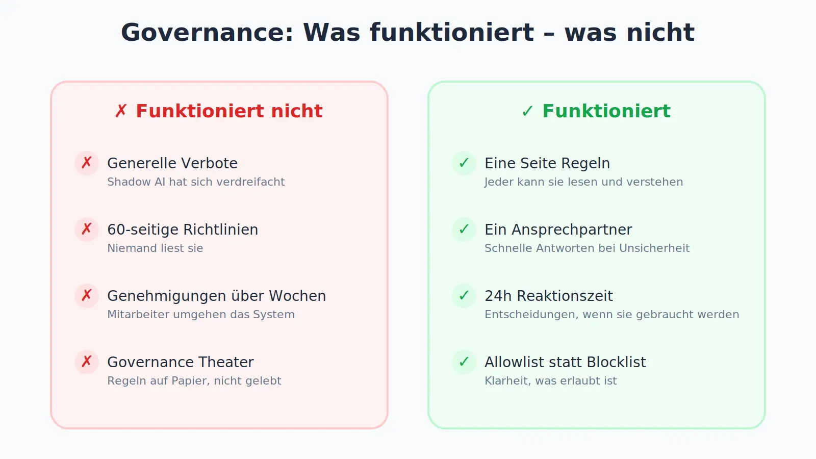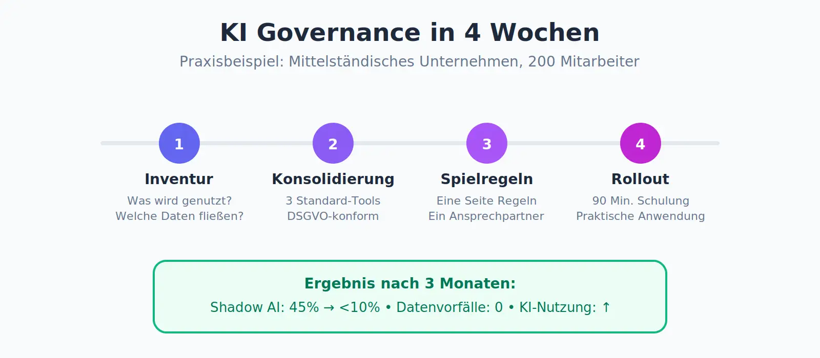The result after three months: Shadow AI usage reduced from 45% to below 10%. No data protection incidents. And, more importantly: Employees use AI more than before because the uncertainty is gone.