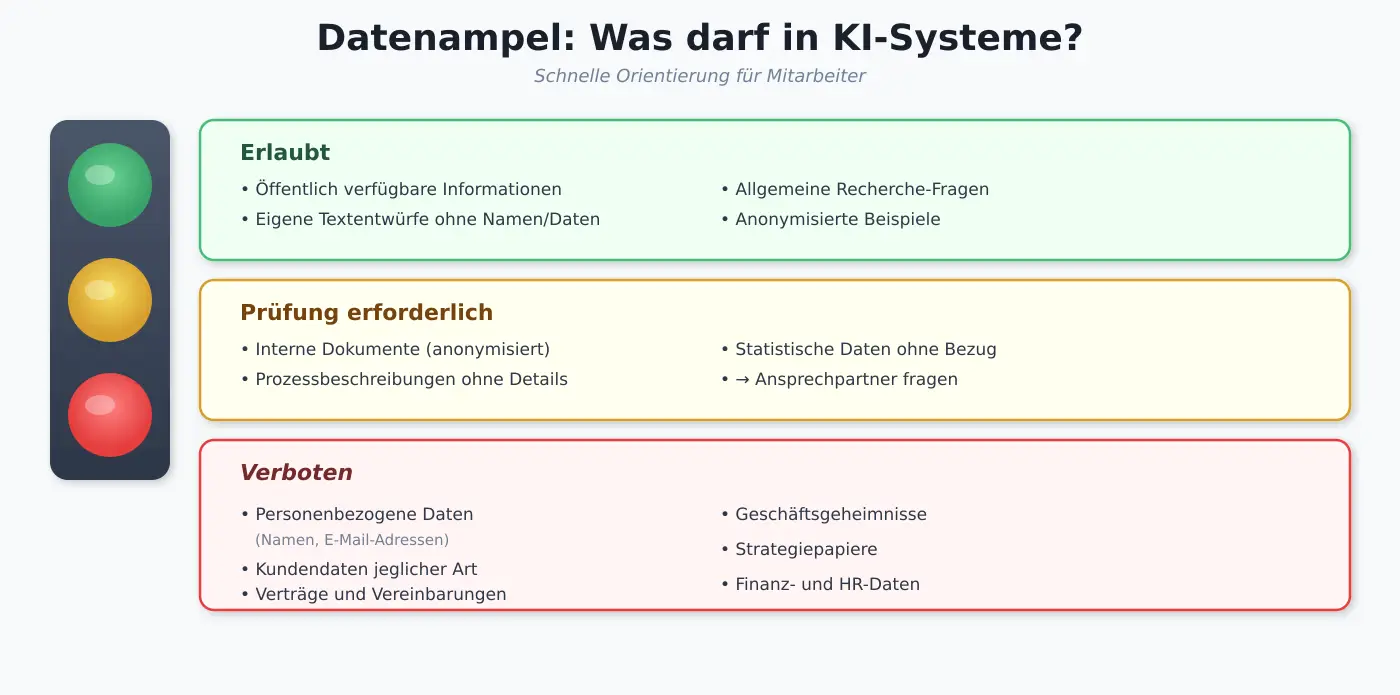 - Classification: Which data may be in external AI systems (no personal data, no trade secrets, no customer data)