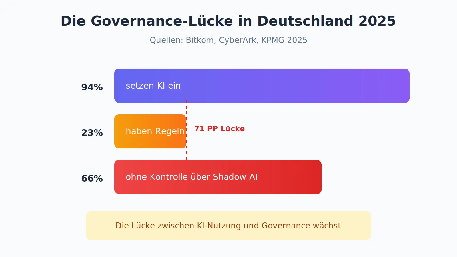 The figures become even clearer: According to KPMG, 69% of German companies have an AI strategy, but only 26% have established a company-wide Trusted AI Governance. And according to a CyberArk study, 66% of German companies do not have complete control over unauthorized AI tools.